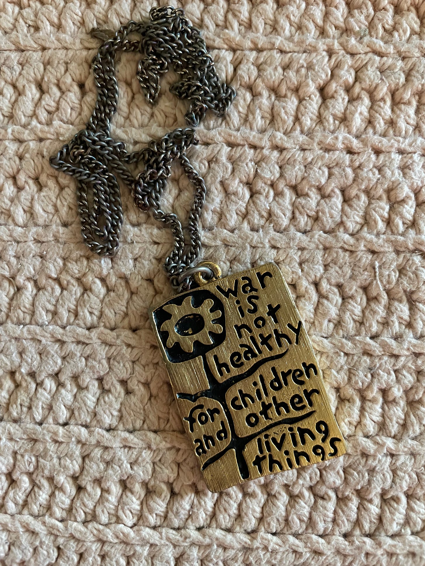 Sadly, it’s now time to wear my necklace “War is not healthy for children and other living things” that I’ve had since the late 60’s-early 70’s. That was evident during yesterday’s protest, too, during which I gave the peace sign instead of raising a first when cars honked their support for our presence. Many people rolled down their window to do the same. (I’ve posted this photo somewhere in an earlier post.)